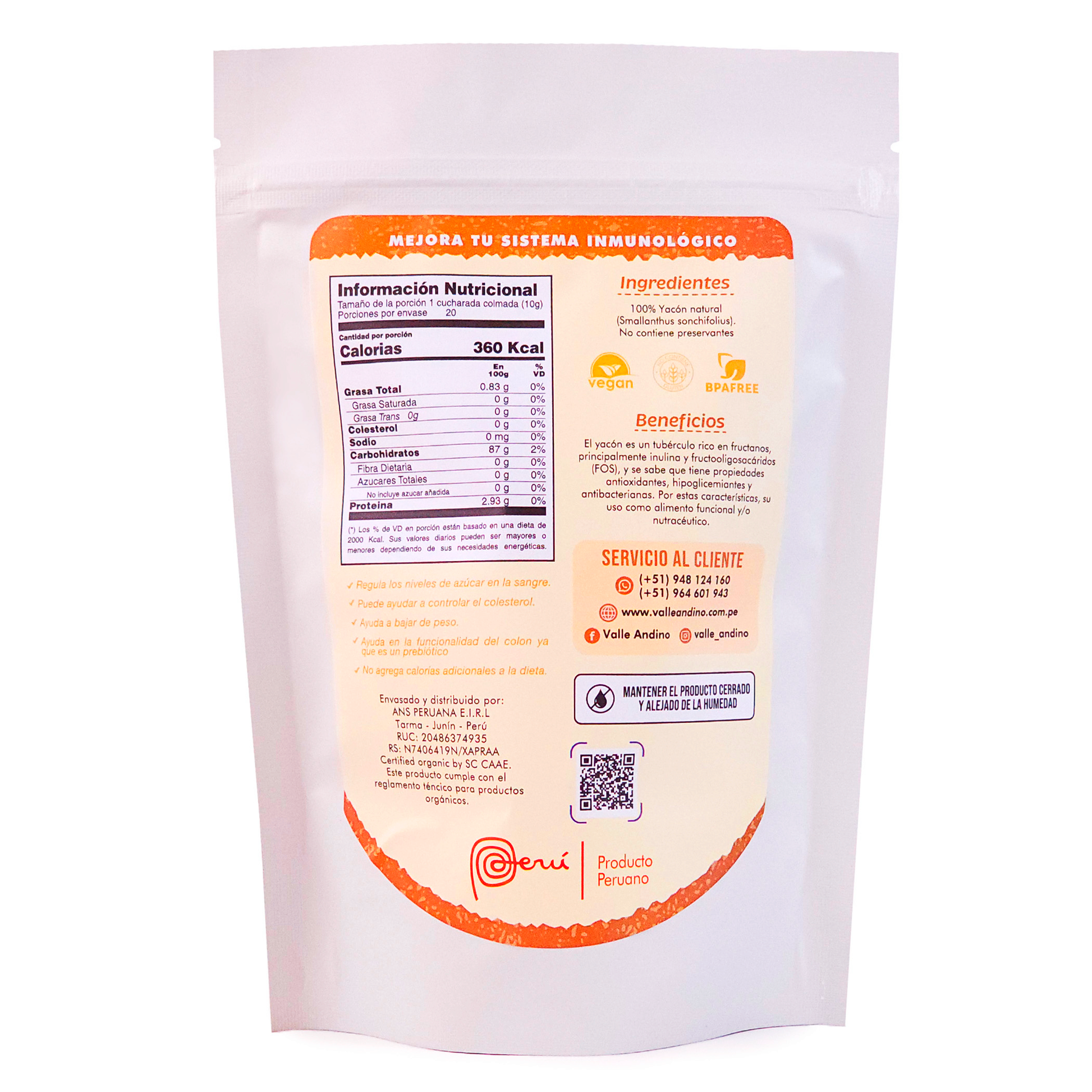 La harina se obtiene a partir de la deshidratación y posterior molienda de las raíces de yacón. Este proceso de deshidratación es controlado minuciosamente cuidando que la temperatura sea baja para evitar la degradación de los principios activos. Por esta razón podemos garantizar en la harina un contenido superior a 40% de fructooligosacáridos.