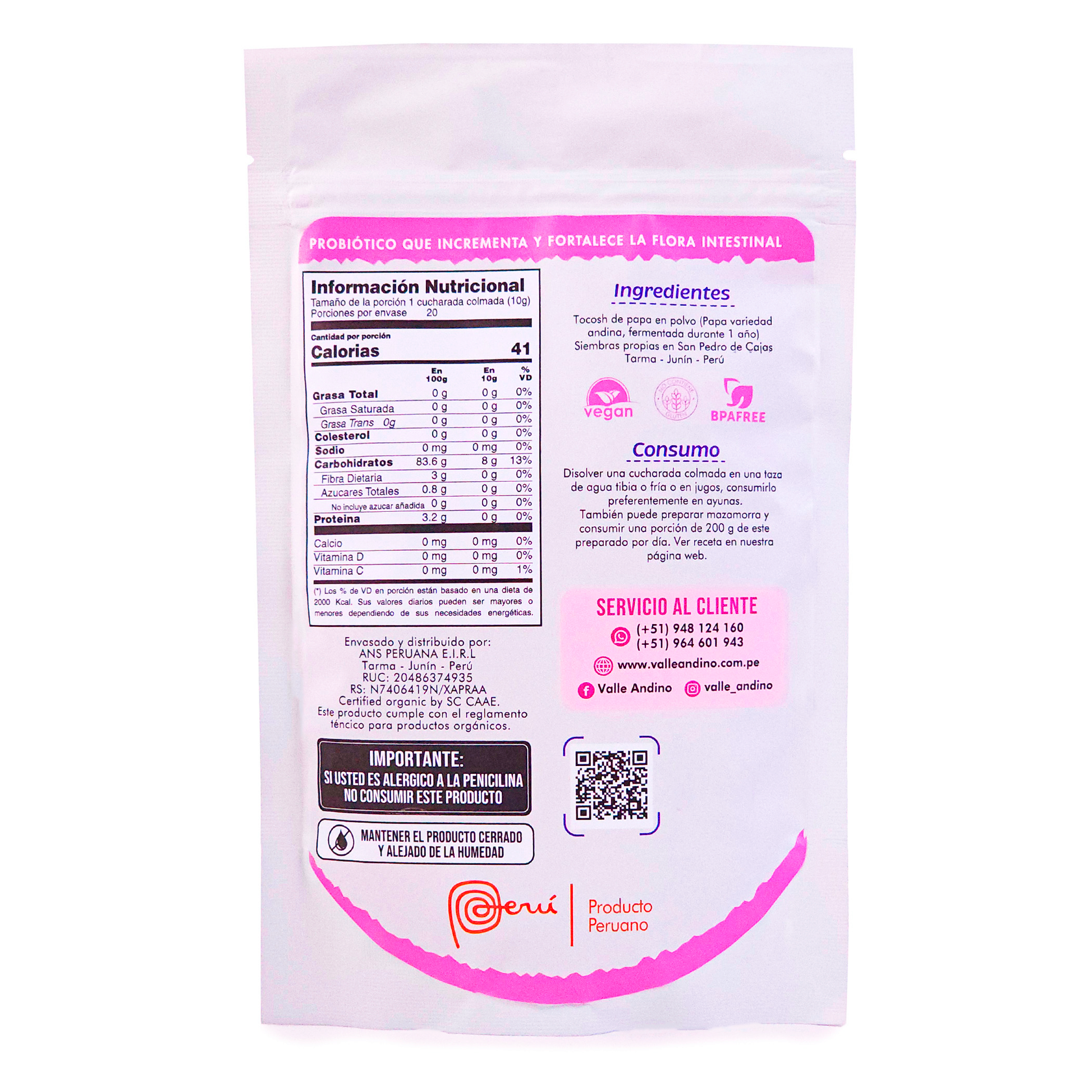 Es el producto de la papa andina orgánica, la que se ha enterrado bajo suelo colocándoles en una cama de paja al pie de un manantial durante un año para lograr la fermentación adecuada y sus beneficios óptimos para la salud. Luego se ha procedido a deshidratarlo con la finalidad de disminuir su peculiar olor manteniendo intactos sus propiedades y beneficios.
